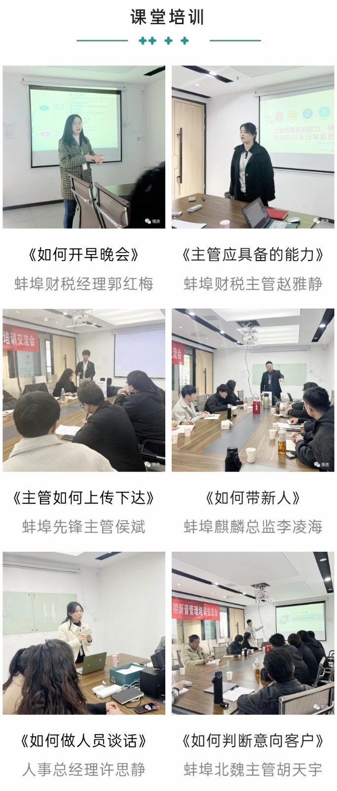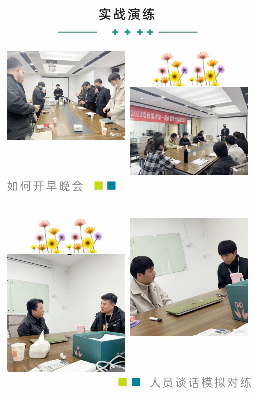 本次培訓(xùn)課程干貨滿滿,圍繞“如何開早晚會”、“主管如何上傳下達(dá)”、“如何帶新人”、“如何判斷意向客戶”、“主管如何做日-周-月度規(guī)劃”等多個維度細(xì)致剖析了在塔孜公司一個管理者應(yīng)具備的專業(yè)知識和技能,配合現(xiàn)場演練,統(tǒng)一規(guī)范管理動作,建立標(biāo)準(zhǔn)化運作模式。
