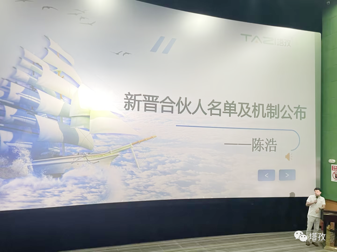 會上,塔孜聯(lián)合創(chuàng)始人陳浩先生做了集團(tuán)合伙人機(jī)制公布。合伙人機(jī)制是為了激勵核心員工與企業(yè)共成長,并分享公司發(fā)展和成長的利益來制定的分紅辦法。