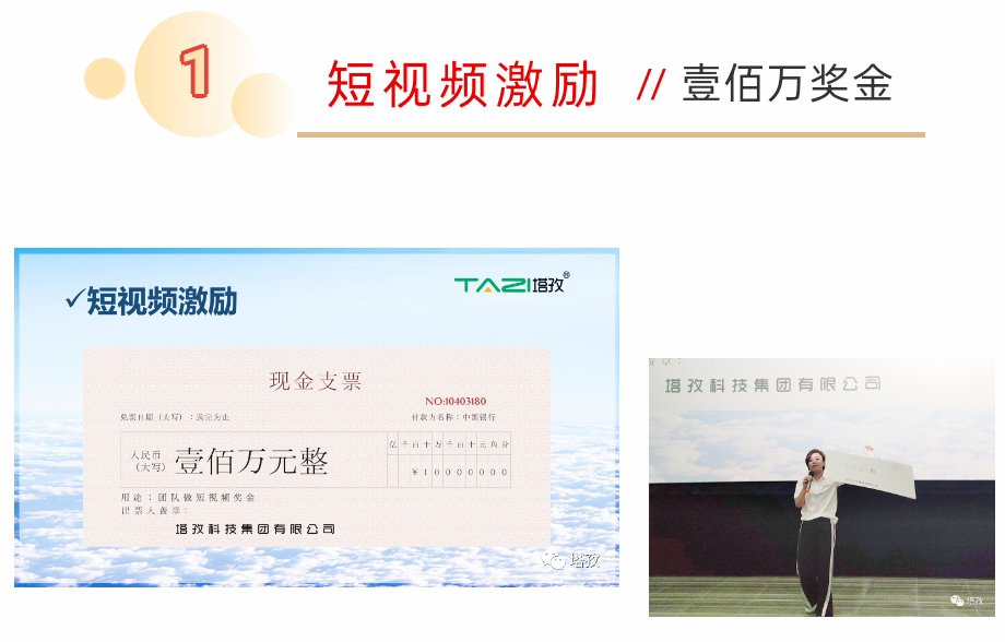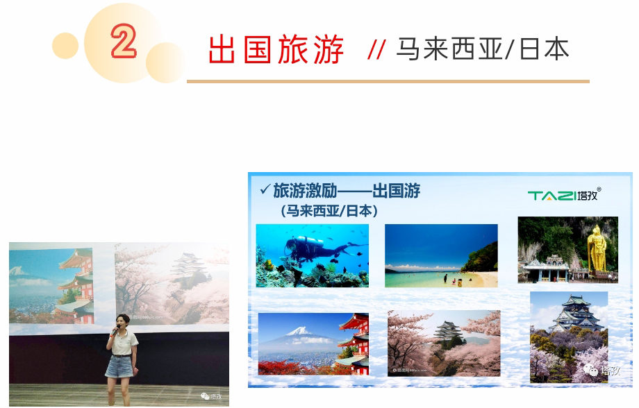 接下來是一個振奮人心的好消息,大會由揚州分公司經(jīng)理吳總和蚌埠總經(jīng)理鄒總,分別為大家公布集團(tuán)下半年激勵政策:“短視頻激勵壹佰萬獎金”和“馬來西亞/日本”出國旅游。