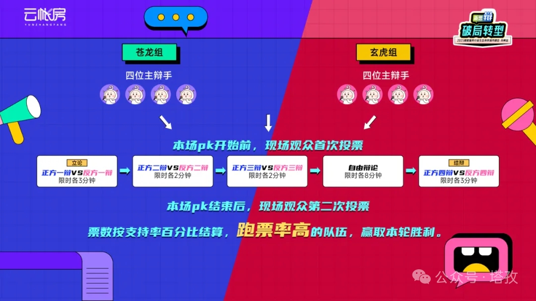 現(xiàn)場(chǎng)近千名財(cái)稅精英進(jìn)行了兩輪投票,以初始投票占比和辯論結(jié)束后的第二輪投票占比之間的增量為標(biāo)準(zhǔn),最終,蒼龍組(正方:優(yōu)先增收)以微弱優(yōu)勢(shì)險(xiǎn)勝。